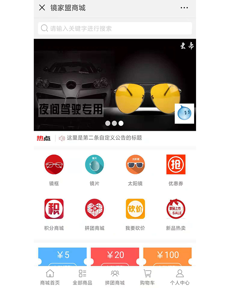 該應(yīng)用是專為眼鏡愛好者的購物公眾號,設(shè)計開發(fā)積分商城、拼團(tuán)、砍價等功能模塊。